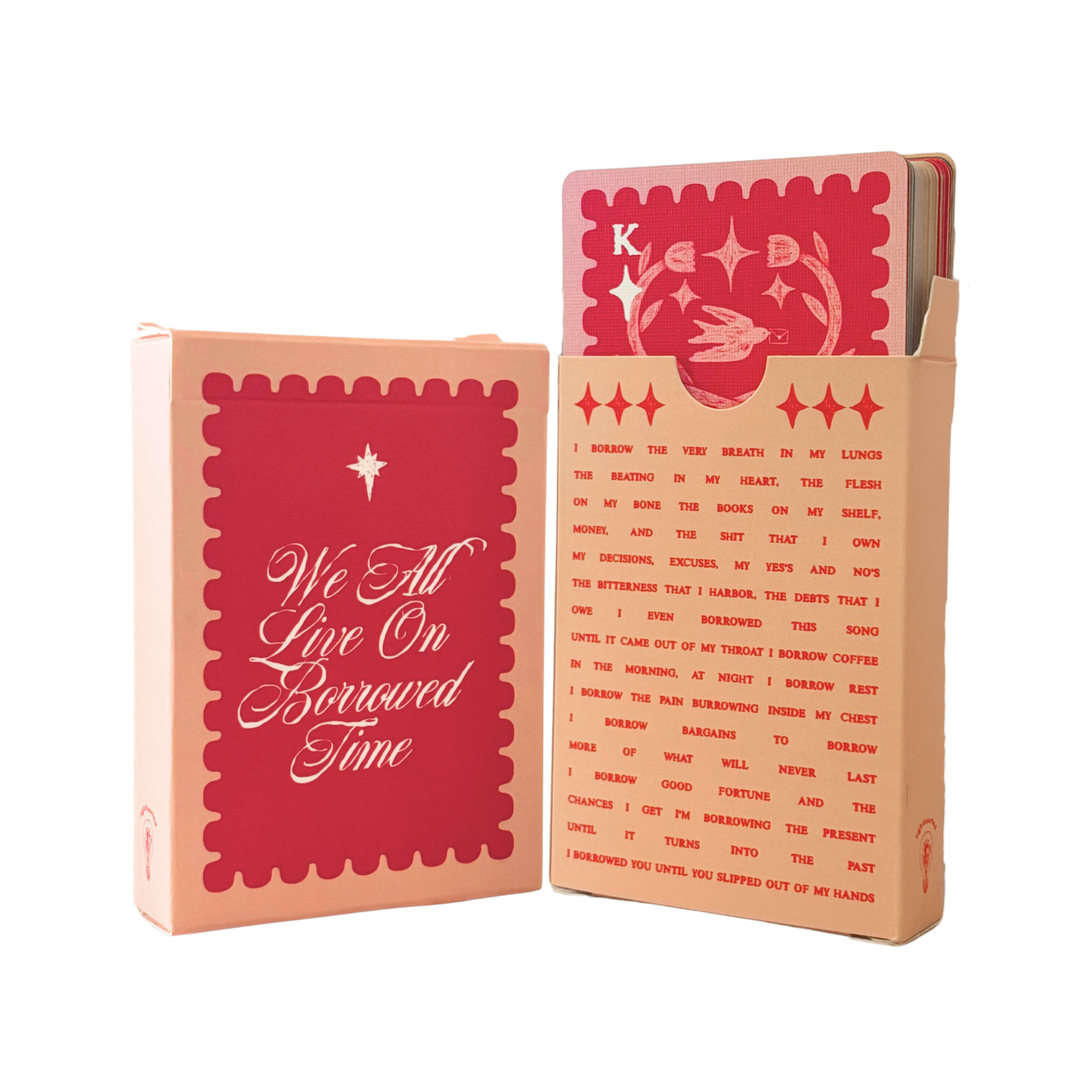 we re-imagined the cover art from the singles off of "we all live on borrowed time," our sophmore record, into the jack, queen, and king face cards. the jack face corresponds to "give or take," the queen face with "whenever you want," & the king face with "ode to a long-distance friend." the back design is derivative of the "borrowed" single cover design. fun, intentional design details from our album are hidden throughout the deck: custom club suite of flowers, custom heart suite, custom diamond suite, colors, and so on and so forth, you'll see.